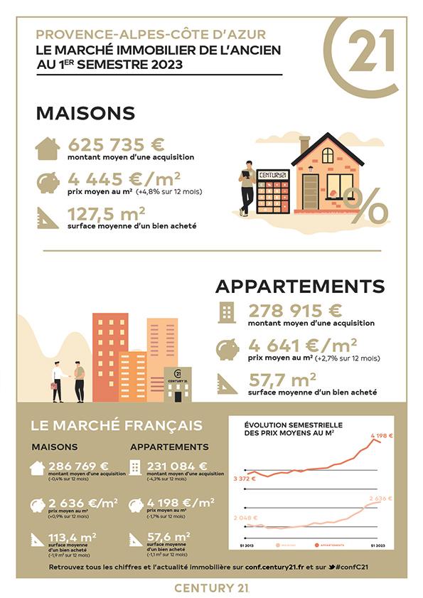 (Infographie du marché immobilier de l’ancien au 1er semestre 2023 en région PACA - Crédits photo : CENTURY 21)