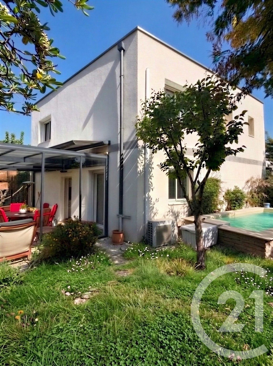 L'extérieur est un véritable enchantement et constitue le point d'orgue de cette propriété. Le jardin plat se présente comme un véritable écrin de verdure totalement préservé des regards indiscrets. Dans ce cadre intimiste et sans aucun vis-à-vis, vous pourrez profiter pleinement de la piscine hors-sol lors des journées ensoleillées. Cette maison n'attend plus que vous pour commencer un nouveau chapitre de vie sous le signe de la tranquillité. Ideally located within walking distance of the historic village in a sought-after environment, this charming and recent contemporary villa represents a rare opportunity for those seeking a lifestyle that is both modern and serene. From the moment you enter, you will be captivated by the soothing atmosphere of the premises, highlighted by a particularly bright living room where every window invites natural light to enhance the spacious volumes.
